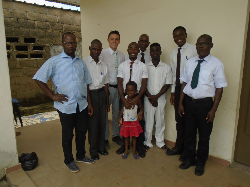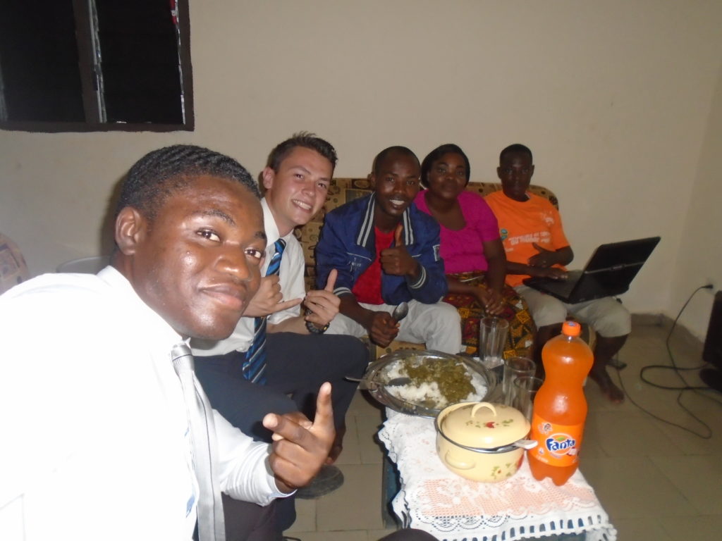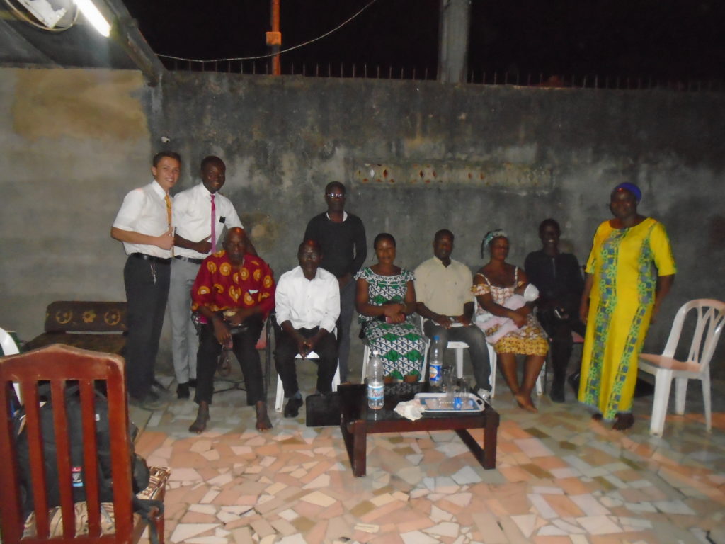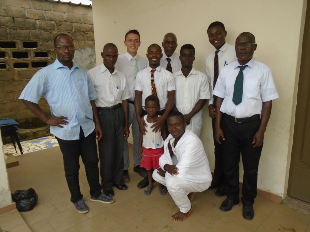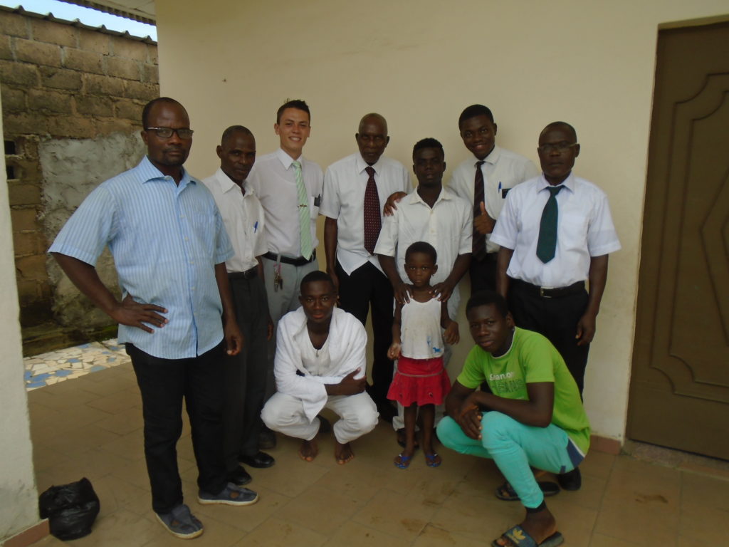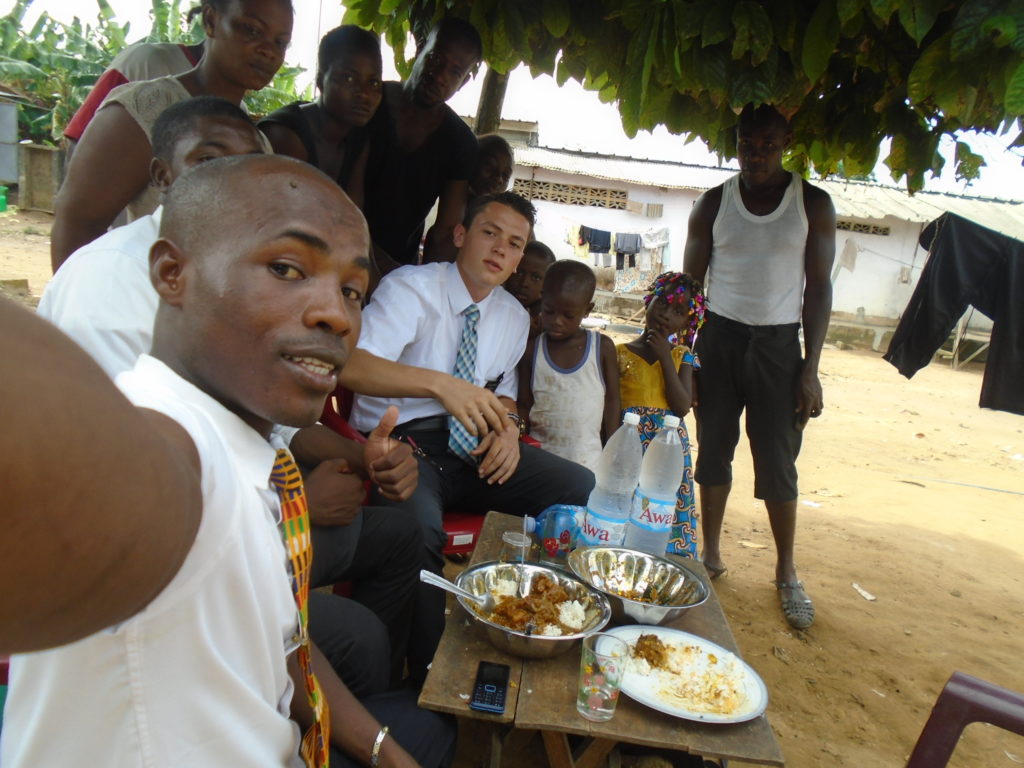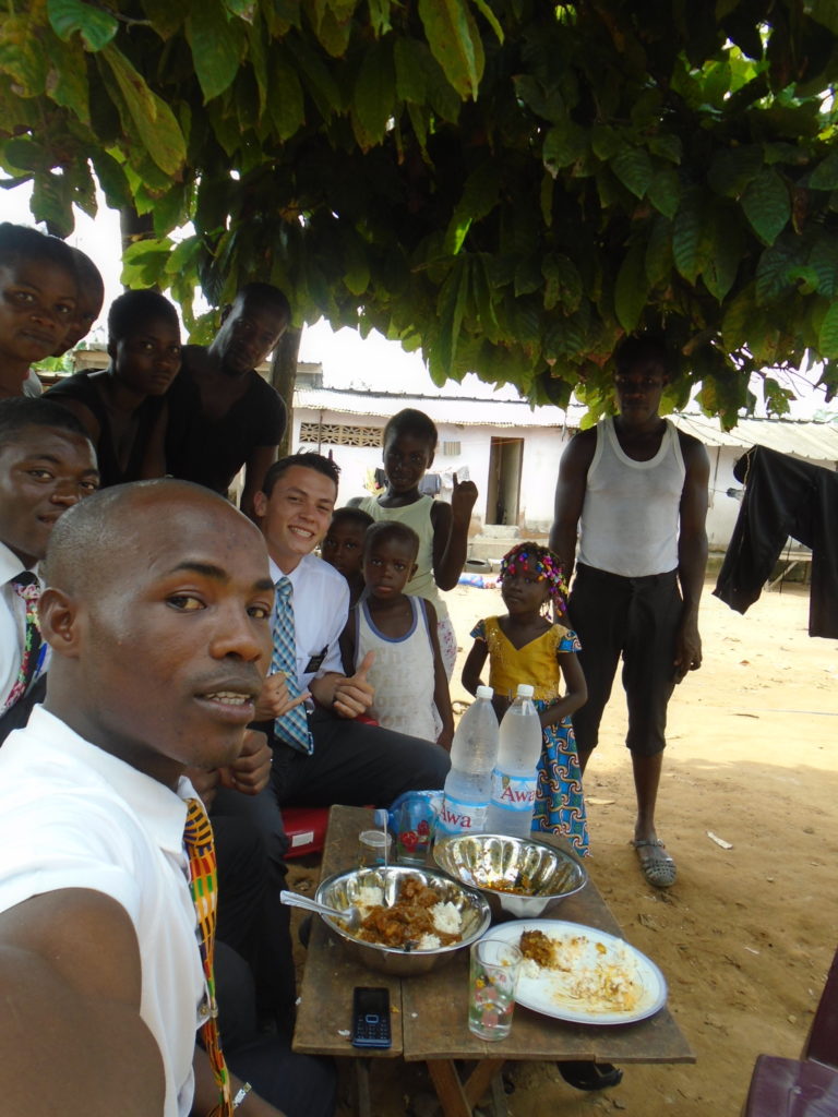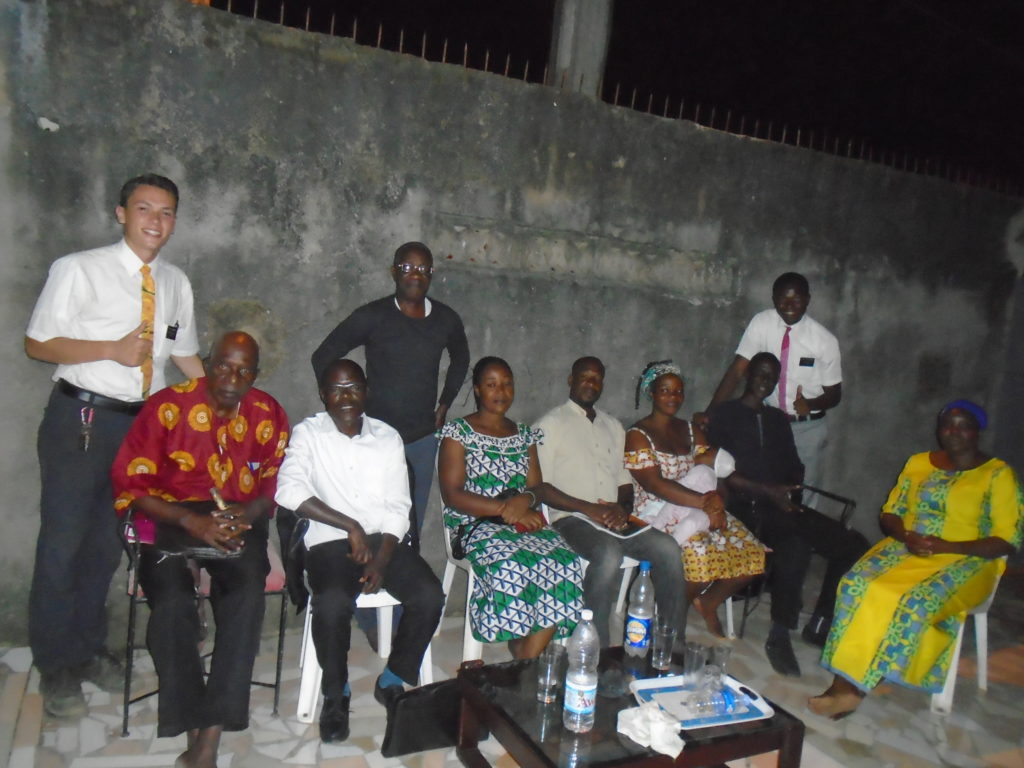 FHE with our new converts family ninssémon, another family who is seriously the best and completely are holding this ward together. Family bolly and then family doué, the ones who have been struggling with their marriage, and then there was this vieux père fr seri who seriously reminds me so much of mom’s dad ron. Seriously the coolest guy!! And then fr dalo the Sunday School president! Such a great night seriously! I have never felt the spirit so strong and seriously that night the lord spoke to these brothers and sisters through me! It was the most incredible experience I’ve ever had on mission! I understand really now how peter felt teaching the disciples of christ with Jesus! Idk it was an amazing experience!!! On top of that fr ninssémon shared a war story which is really his conversion story. It seriously brought tears to my eyes!!!! During the war he was taken hostage and separated from his family for a year and had no communication with them. They had no clue where he was and what had happened and if he was even alive! During this time he was at a camp and was put in a cell that literally was 3ft by 5ft by 6ft or something like that. Just some puny little box that to lay down to sleep at night he had to turn his body and put his legs up on the wall just to get his back flat. It was when i heard that that literally i just wanted to cry. He explained how they treated him super bad and he didn’t have much food or water and then it wasn’t till after that one day they came and said that he was free to go and that he was the only one free to go that they had no charges against him. On the other side back at home his wife everyday would pray for him and never lost hope everyone thought he was gone and dead but she never lost hope in him and now they are back together and happy. Seriously he just started getting emotional at this point just thanking us for the blessing we have been to him that the gospel has changed his life completely. That Sunday his little brother came over right after his confirmation and was trying to get him to go to the bar with him (he was a heavy drinker before his baptism). He followed the spirit and didn’t go and in explaining that seriously the spirit was so strong everyone was so shocked! It was so incredible! He is this huge jacked military guy that turned soft cuz of the gospel! It has been so amazing to see his life completely change !!!!! So yeah super awesome experience and the highlight for sure of the week!!!!! We then had a mangez-vous with family doué chez ma famille gueré on a mangé foufou manioc avec sauce longueur c’était très doux je te dis!!!!!! So yeah super awesome week!!!! Have an awesome week!