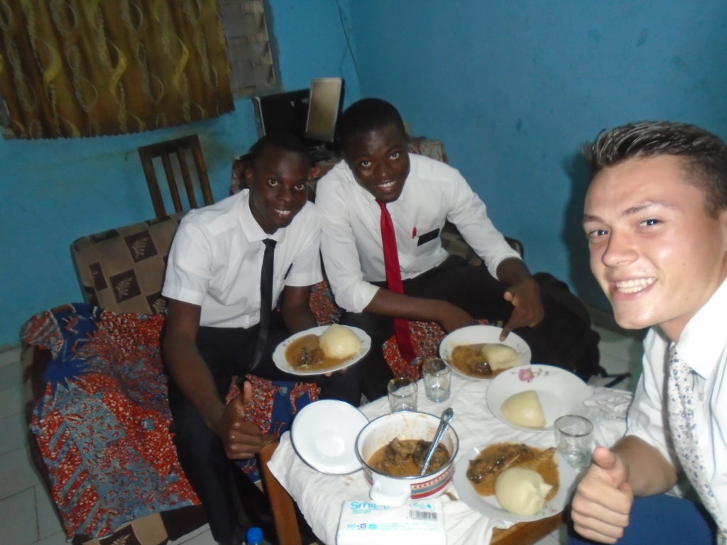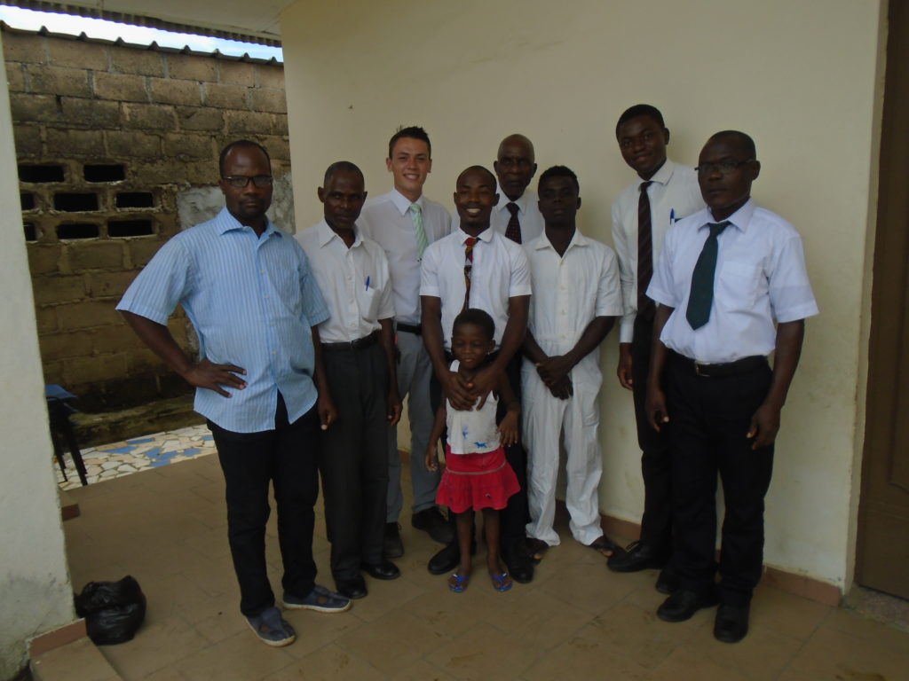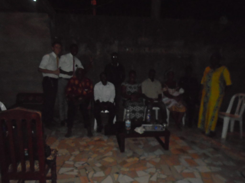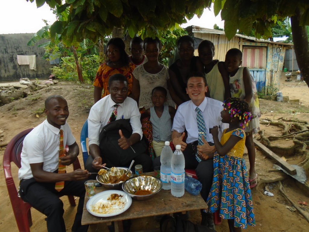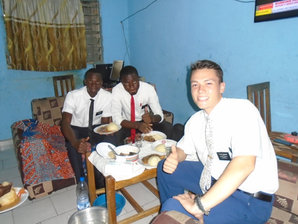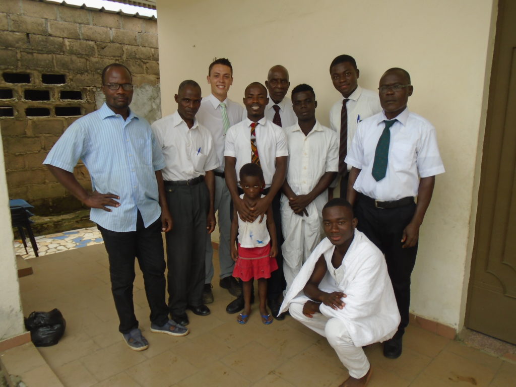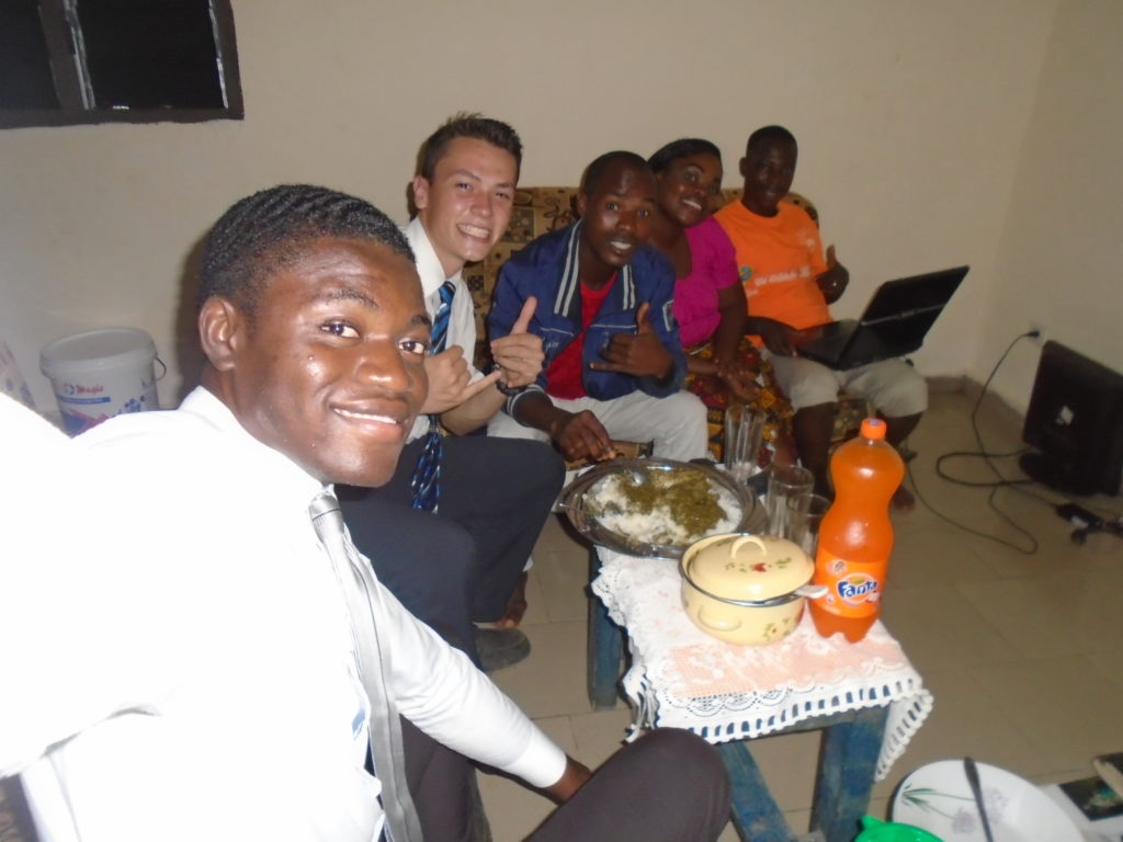 FHE with our new converts family ninssémon, another family who is seriously the best and completely are holding this ward together. Family bolly and then family doué, the ones who have been struggling with their marriage, and then there was this vieux père fr seri who seriously reminds me so much of mom’s dad ron. Seriously the coolest guy!! And then fr dalo the Sunday School president! Such a great night seriously! I have never felt the spirit so strong and seriously that night the lord spoke to these brothers and sisters through me! It was the most incredible experience I’ve ever had on mission! I understand really now how peter felt teaching the disciples of christ with Jesus! Idk it was an amazing experience!!! On top of that fr ninssémon shared a war story which is really his conversion story. It seriously brought tears to my eyes!!!! During the war he was taken hostage and separated from his family for a year and had no communication with them. They had no clue where he was and what had happened and if he was even alive! During this time he was at a camp and was put in a cell that literally was 3ft by 5ft by 6ft or something like that. Just some puny little box that to lay down to sleep at night he had to turn his body and put his legs up on the wall just to get his back flat. It was when i heard that that literally i just wanted to cry. He explained how they treated him super bad and he didn’t have much food or water and then it wasn’t till after that one day they came and said that he was free to go and that he was the only one free to go that they had no charges against him. On the other side back at home his wife everyday would pray for him and never lost hope everyone thought he was gone and dead but she never lost hope in him and now they are back together and happy. Seriously he just started getting emotional at this point just thanking us for the blessing we have been to him that the gospel has changed his life completely. That Sunday his little brother came over right after his confirmation and was trying to get him to go to the bar with him (he was a heavy drinker before his baptism). He followed the spirit and didn’t go and in explaining that seriously the spirit was so strong everyone was so shocked! It was so incredible! He is this huge jacked military guy that turned soft cuz of the gospel! It has been so amazing to see his life completely change !!!!! So yeah super awesome experience and the highlight for sure of the week!!!!! We then had a mangez-vous with family doué chez ma famille gueré on a mangé foufou manioc avec sauce longueur c’était très doux je te dis!!!!!! So yeah super awesome week!!!! Have an awesome week!