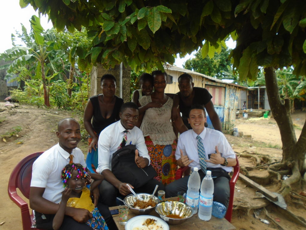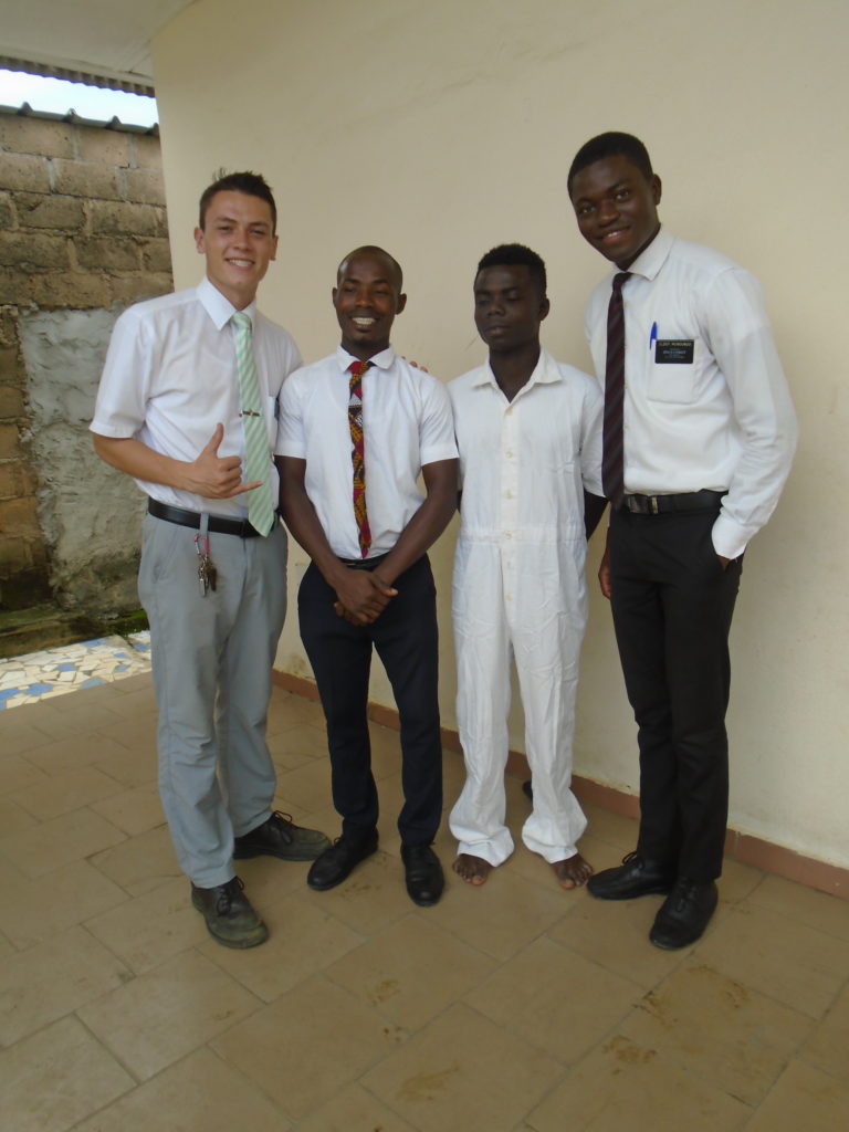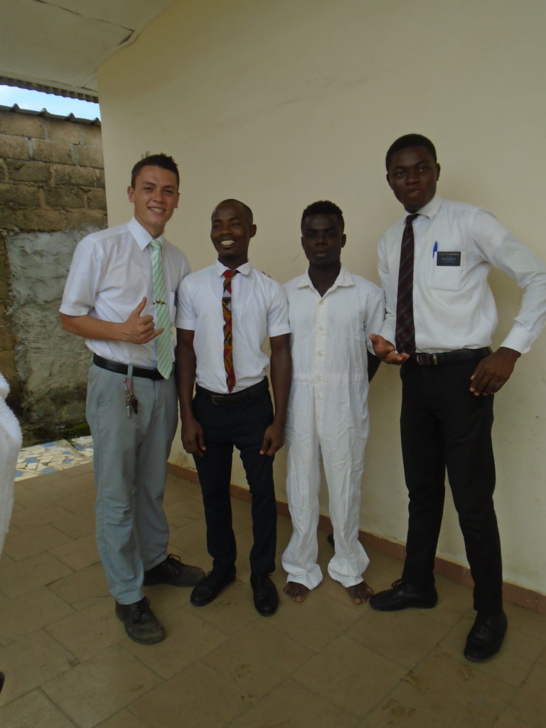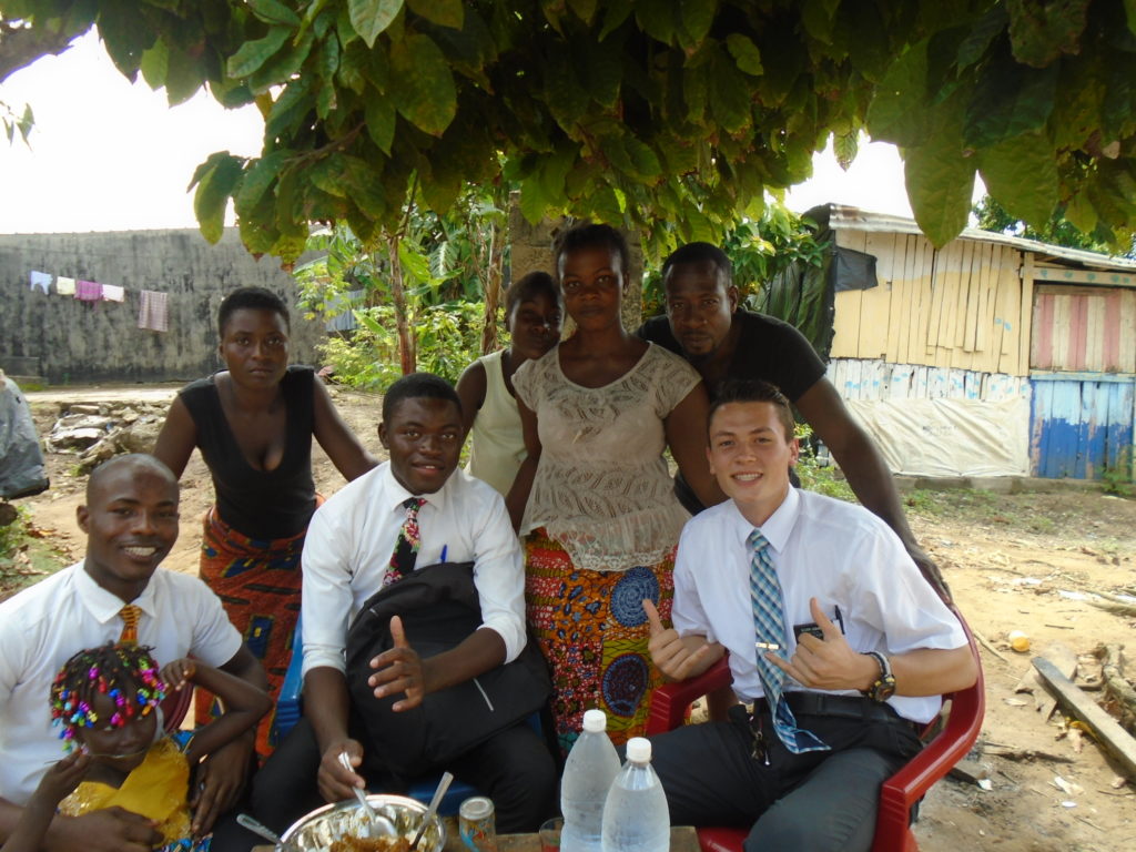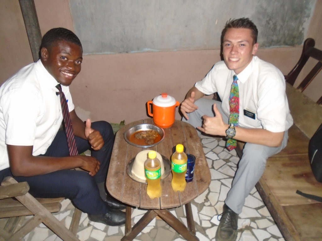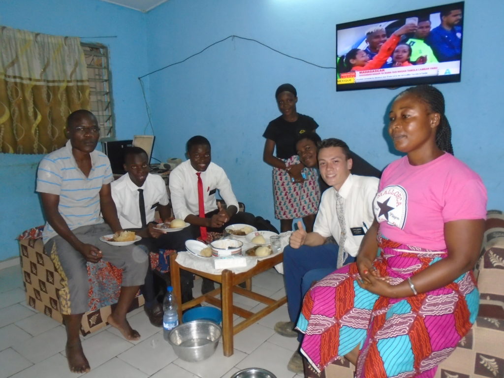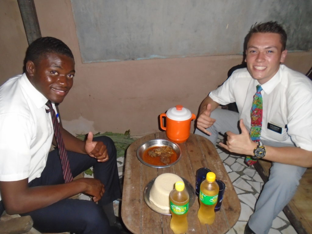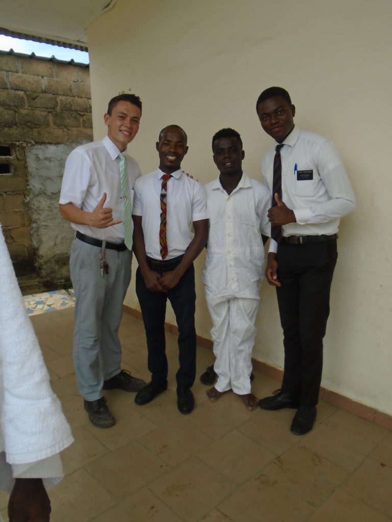 FHE with our new converts family ninssémon, another family who is seriously the best and completely are holding this ward together. Family bolly and then family doué, the ones who have been struggling with their marriage, and then there was this vieux père fr seri who seriously reminds me so much of mom’s dad ron. Seriously the coolest guy!! And then fr dalo the Sunday School president! Such a great night seriously! I have never felt the spirit so strong and seriously that night the lord spoke to these brothers and sisters through me! It was the most incredible experience I’ve ever had on mission! I understand really now how peter felt teaching the disciples of christ with Jesus! Idk it was an amazing experience!!! On top of that fr ninssémon shared a war story which is really his conversion story. It seriously brought tears to my eyes!!!! During the war he was taken hostage and separated from his family for a year and had no communication with them. They had no clue where he was and what had happened and if he was even alive! During this time he was at a camp and was put in a cell that literally was 3ft by 5ft by 6ft or something like that. Just some puny little box that to lay down to sleep at night he had to turn his body and put his legs up on the wall just to get his back flat. It was when i heard that that literally i just wanted to cry. He explained how they treated him super bad and he didn’t have much food or water and then it wasn’t till after that one day they came and said that he was free to go and that he was the only one free to go that they had no charges against him. On the other side back at home his wife everyday would pray for him and never lost hope everyone thought he was gone and dead but she never lost hope in him and now they are back together and happy. Seriously he just started getting emotional at this point just thanking us for the blessing we have been to him that the gospel has changed his life completely. That Sunday his little brother came over right after his confirmation and was trying to get him to go to the bar with him (he was a heavy drinker before his baptism). He followed the spirit and didn’t go and in explaining that seriously the spirit was so strong everyone was so shocked! It was so incredible! He is this huge jacked military guy that turned soft cuz of the gospel! It has been so amazing to see his life completely change !!!!! So yeah super awesome experience and the highlight for sure of the week!!!!! We then had a mangez-vous with family doué chez ma famille gueré on a mangé foufou manioc avec sauce longueur c’était très doux je te dis!!!!!! So yeah super awesome week!!!! Have an awesome week!