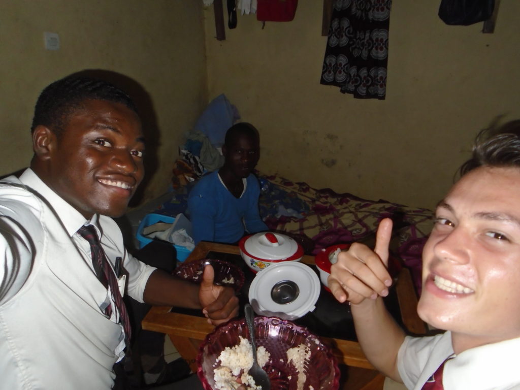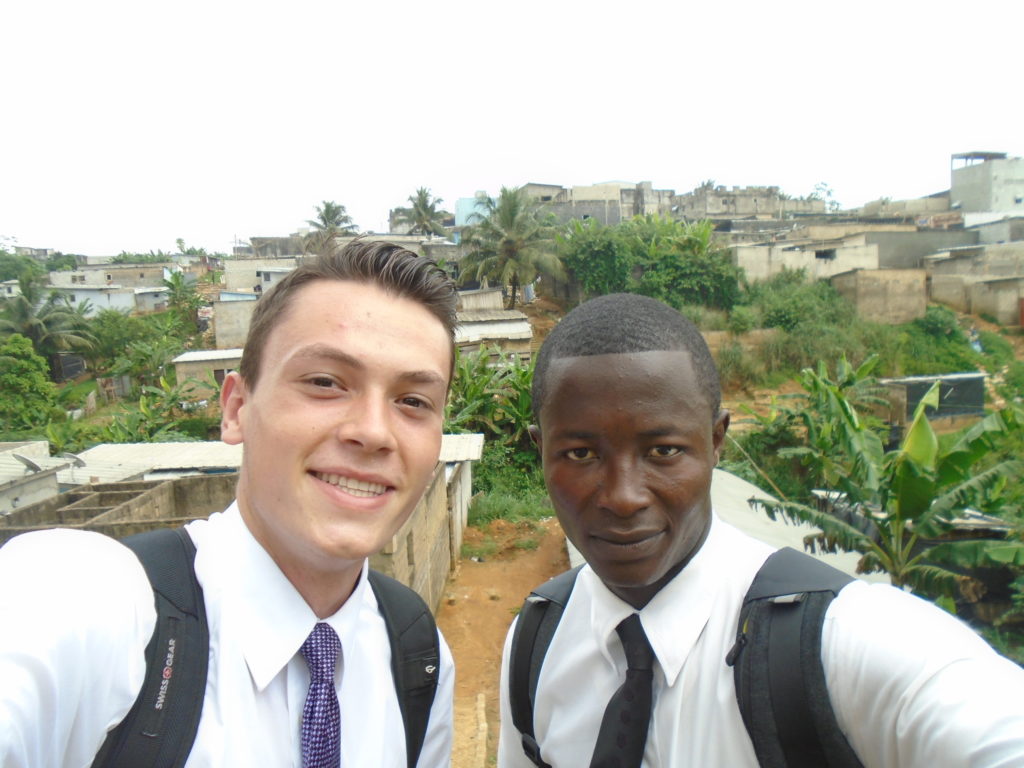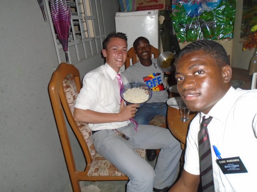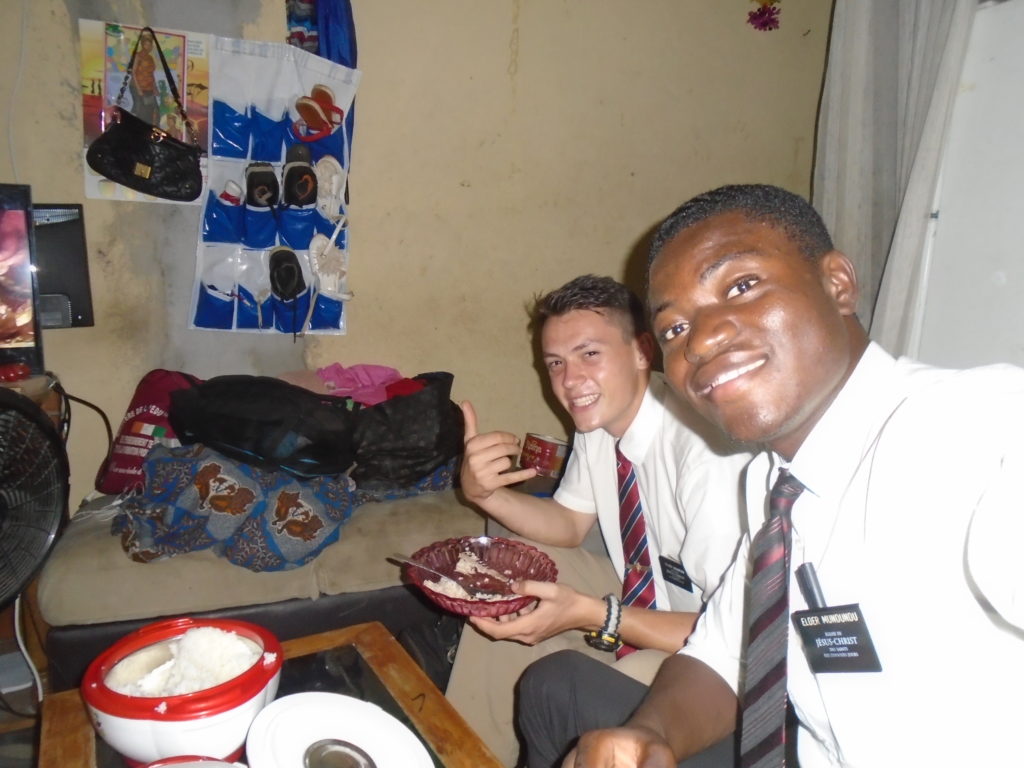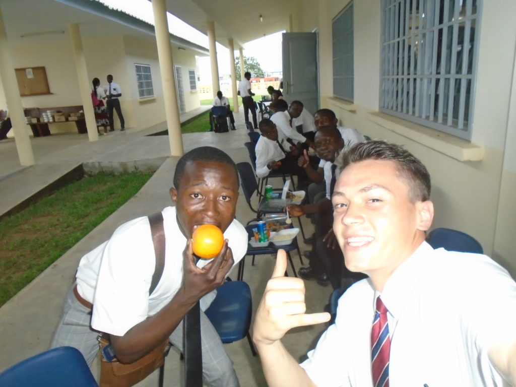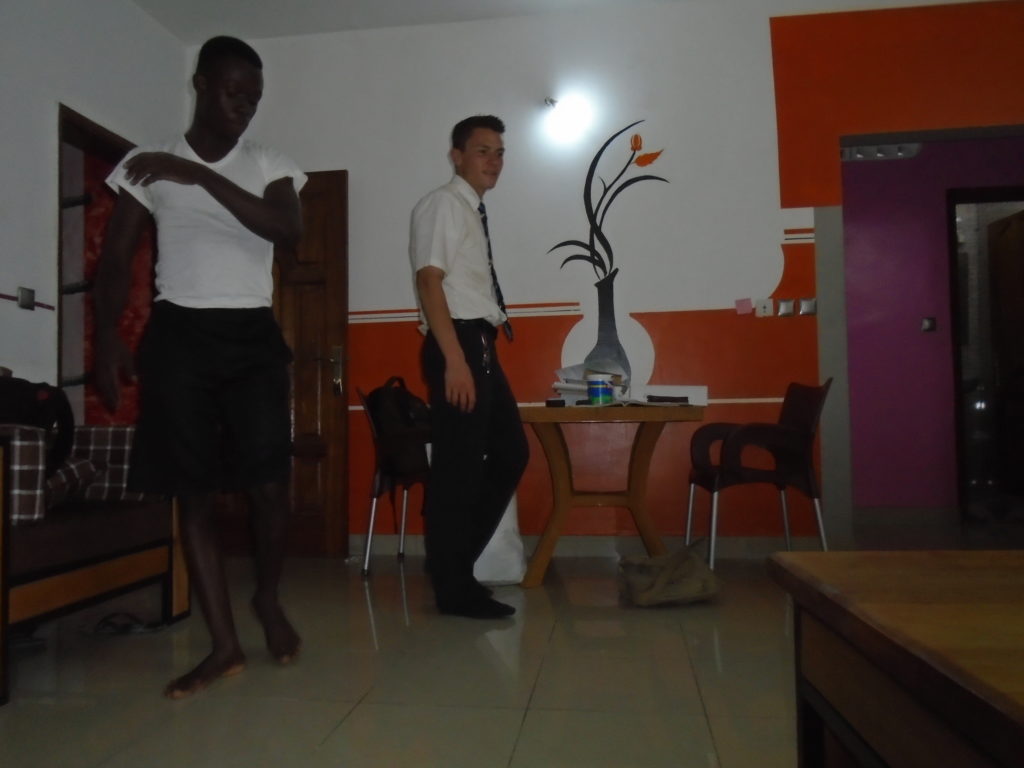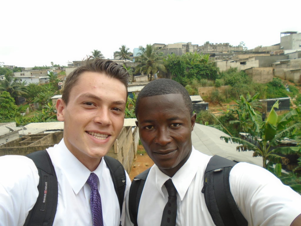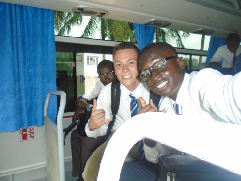 FHE with our new converts family ninssémon, another family who is seriously the best and completely are holding this ward together. Family bolly and then family doué, the ones who have been struggling with their marriage, and then there was this vieux père fr seri who seriously reminds me so much of mom’s dad ron. Seriously the coolest guy!! And then fr dalo the Sunday School president! Such a great night seriously! I have never felt the spirit so strong and seriously that night the lord spoke to these brothers and sisters through me! It was the most incredible experience I’ve ever had on mission! I understand really now how peter felt teaching the disciples of christ with Jesus! Idk it was an amazing experience!!! On top of that fr ninssémon shared a war story which is really his conversion story. It seriously brought tears to my eyes!!!! During the war he was taken hostage and separated from his family for a year and had no communication with them. They had no clue where he was and what had happened and if he was even alive! During this time he was at a camp and was put in a cell that literally was 3ft by 5ft by 6ft or something like that. Just some puny little box that to lay down to sleep at night he had to turn his body and put his legs up on the wall just to get his back flat. It was when i heard that that literally i just wanted to cry. He explained how they treated him super bad and he didn’t have much food or water and then it wasn’t till after that one day they came and said that he was free to go and that he was the only one free to go that they had no charges against him. On the other side back at home his wife everyday would pray for him and never lost hope everyone thought he was gone and dead but she never lost hope in him and now they are back together and happy. Seriously he just started getting emotional at this point just thanking us for the blessing we have been to him that the gospel has changed his life completely. That Sunday his little brother came over right after his confirmation and was trying to get him to go to the bar with him (he was a heavy drinker before his baptism). He followed the spirit and didn’t go and in explaining that seriously the spirit was so strong everyone was so shocked! It was so incredible! He is this huge jacked military guy that turned soft cuz of the gospel! It has been so amazing to see his life completely change !!!!! So yeah super awesome experience and the highlight for sure of the week!!!!! We then had a mangez-vous with family doué chez ma famille gueré on a mangé foufou manioc avec sauce longueur c’était très doux je te dis!!!!!! So yeah super awesome week!!!! Have an awesome week!