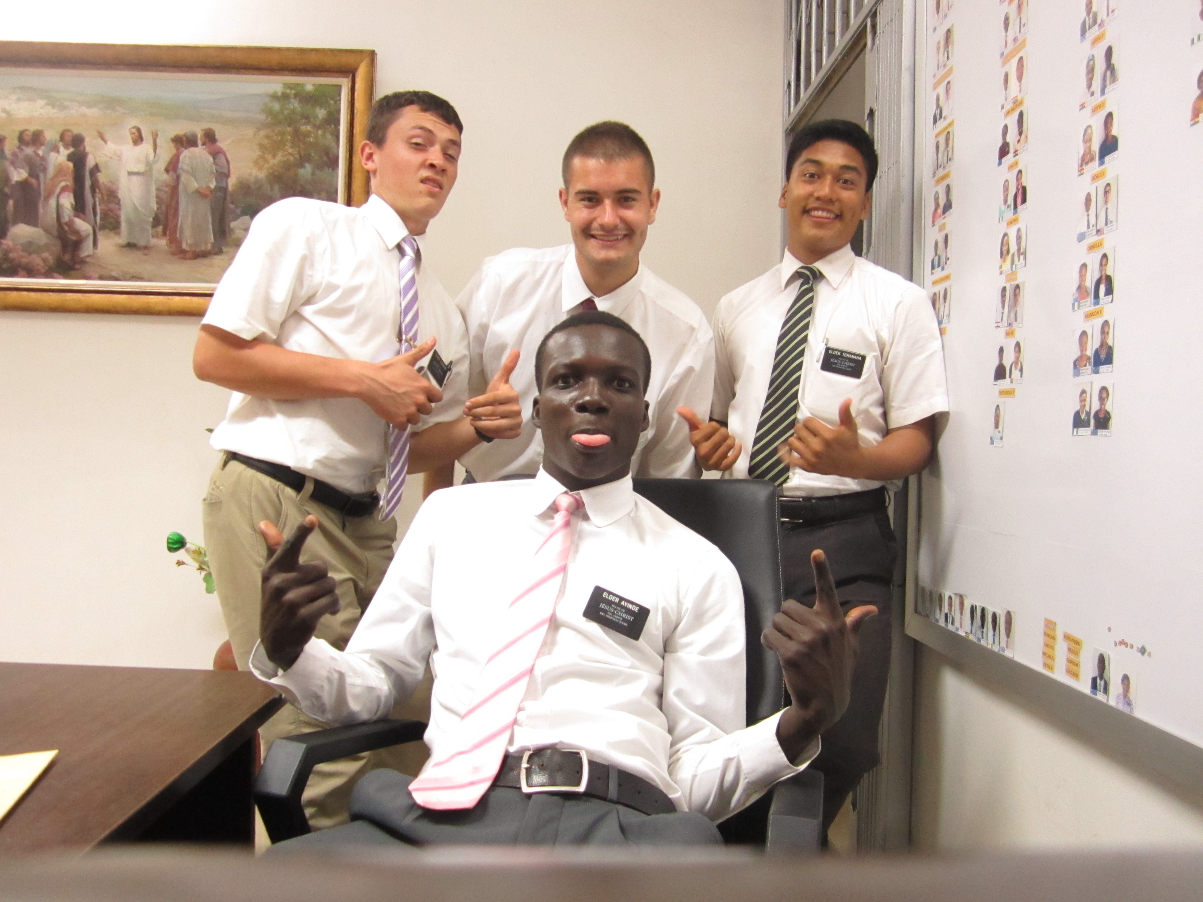 Looks like you guys had a fun week! Do you like that pic of my comp? It was so funny. I was like dude get in the room I gotta take your picture. He was like okay I’m gonna do something crazy then he just got up on the beds it was so funny! He’s awesome! I love him. He’s had a really hard life, but he’s a great guy. Man, I’m so tired from sports this morning!!! It was super fun. We all got together as a zone and played soccer. I’m getting really good! haha . Earlier today I wrestled another missionary who was a huge Polynesian and put him on his butt. It was dope!!! Everyone went nuts hahahha! It was super funny. We haven’t been able to much work this week. We don’t get a lot of time in the secteur because it’s so far away. We do have a baptism lined up this Saturday. He’s this cute 14 year old. He’s a stud!!! Pray it goes through! Also pray we can find more investigators to teach that come to church lololol! My comp’s first trainer he had for only a few weeks because he wasn’t being obedient so the President gave him to me to train. He would go to the cyber for like 10 hrs at a time. Crazy, right? This mission is so different than any other mission in the world! Its tough, but I love it man!!! Never a dull moment. It’s all good. I really do love this place. The Lord has helped me a ton. I used to be such a negative person!!! I now see good in everything no matter what happens. I forgot to tell you the kid with the glasses is Elder Duncan he is my district leader and then I have some with me and Elder Morrelll and my comp and also with my new zone leader elder Motshikana. I love these guys. It’s the first time I’ve been in an apartment with such spiritual missionaries. It’s the best! Well family, have an awesome week! I’ll keep praying for all of you! I love you soooo much!